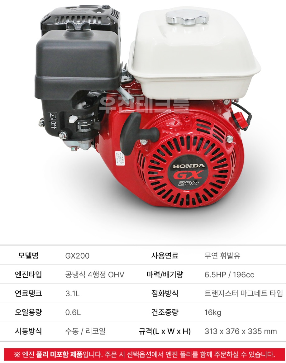 엔진 타입: 공랭식 4행정 OHV(Over Head Valve) 가솔린 엔진, 단기통, 수평 축 배기량: 196cc 실린더 직경 x 행정거리: 68x54mm 최대 출력 (Net Power): 4.3kW (5.8 HP) / 3,600rpm 최대 토크 (Net Torque): 12.4Nm / 2,500rpm 압축비: 8.5 : 1 시동 방식: 수동 (리코일 스타터), 옵션: 전기 시동 (Electric Start) 연료 탱크 용량: 3.1 \text{ ℓ} 엔진 오일 용량: 0.6 \text{ ℓ} 연료 소비율 (정격 출력 시) 약 1.7 \text{ ℓ/h} / 3,600 \text{ rpm} 건조 중량 (Dry Weight): 약 16 \text{ kg} \sim 16.1 \text{ kg} 점화 방식: 트랜지스터 마그네토 (Transistorized Magneto) 주요 특징: 주철 실린더 슬리브, 오일 경고 시스템 (Oil Alert)