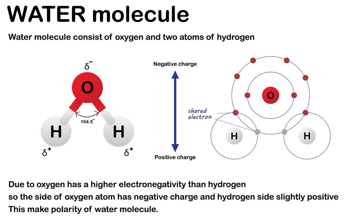 물 (H₂O) 분자는 산소 원자(O)가 수소 원자(H)보다 전자를 더 강하게 끌어당기기 때문에 '극성(Polarity)'을 띈다.
