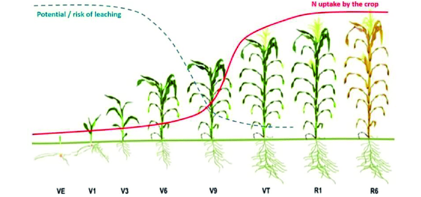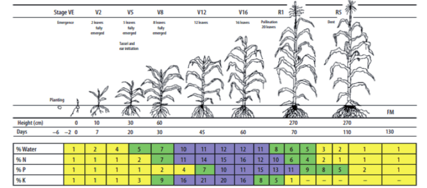 옥수수(Corn) 생육 단계 - V (Vegetative), R (Reproductive), VT (Tasseling, 수꽃 출현기), R1 (Silking, 수염 출현기) https://infos.tistory.com/7338옥수수는 잎 6장(V6)부터 수꽃(Tassel)이 나오고 수염(Silk)이 나오는 시기(VT/R1) 사이에 전체 생육 기간 중 하루당 양분(N, K) 흡수량(Flux)이 가장 많은 시기다. 따라서 농가에서는 이 시기 이전에 충분한 밑거름과 핵심 웃거름(추비)을 주어 양분이 가장 필요한 시기에 부족함이 없도록 관리하는 것이 고품질, 다수확의 핵심이다.