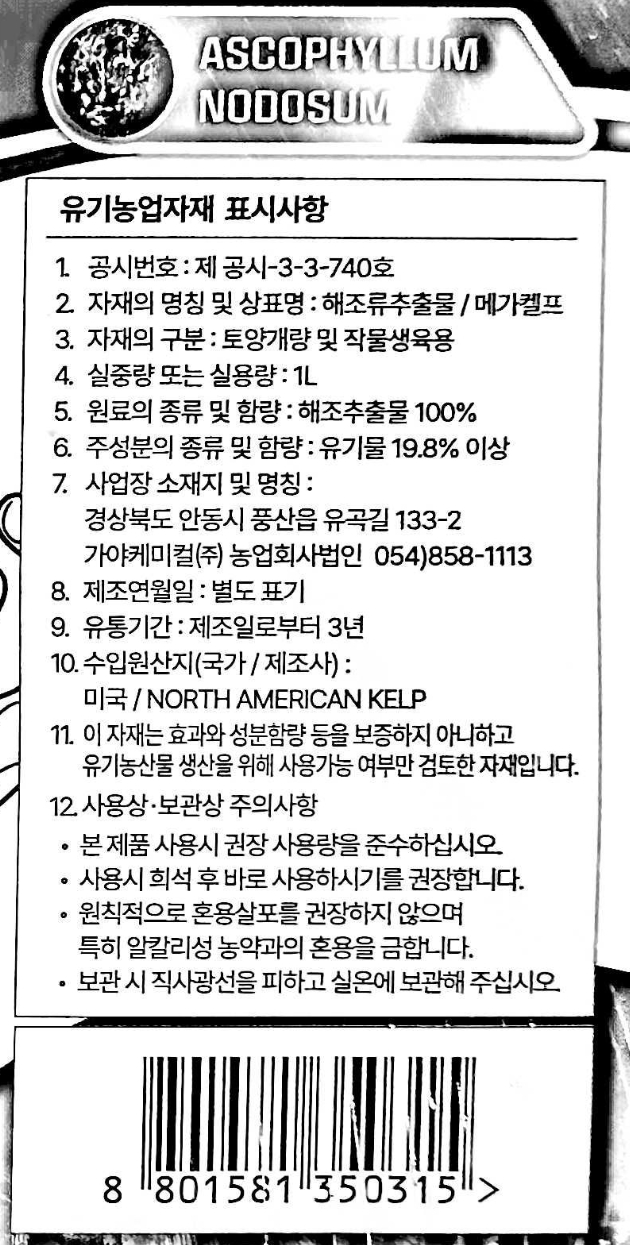 원료 및 함량: 해조추출물 100% (유기물 19.8% 이상 함량)